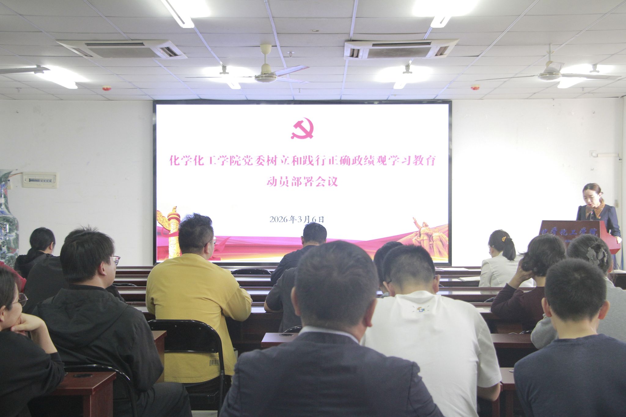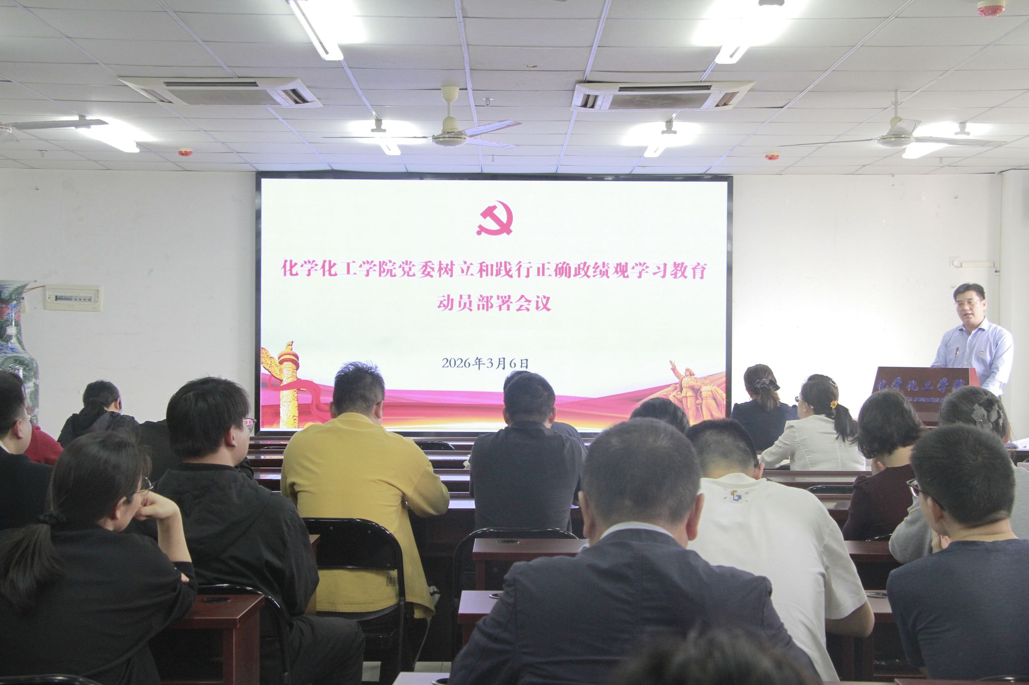 党委在研发楼710会议室召开树立和践行正确政绩观学习教育动员部署会议。学院党政领导班子成员、各系及科室负责人、全体教职工党员参会。会议由党委副书记熊文军主持。