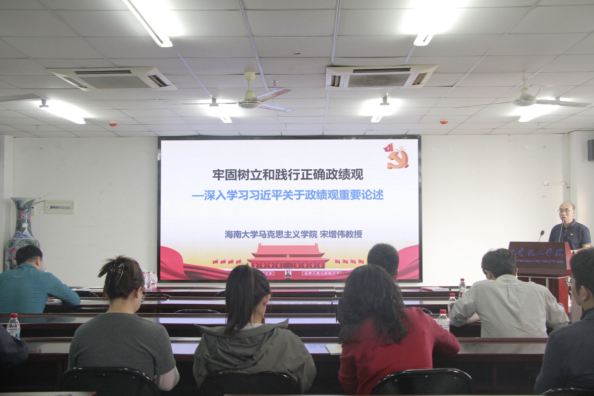 会议第二阶段邀请海南大学马克思主义学院宋增伟教授作题为《牢固树立和践行正确政绩观—深入学习习近平总书记关于政绩观的重要论述》的专题辅导报告,宋教授从学习要求、重要意义、丰富内涵、工作机制和爱岗敬业五个方面对树立和践行正确政绩观作了系统深入的解读,为与会人员带来一场既有理论深度又有实践温度的专题党课。