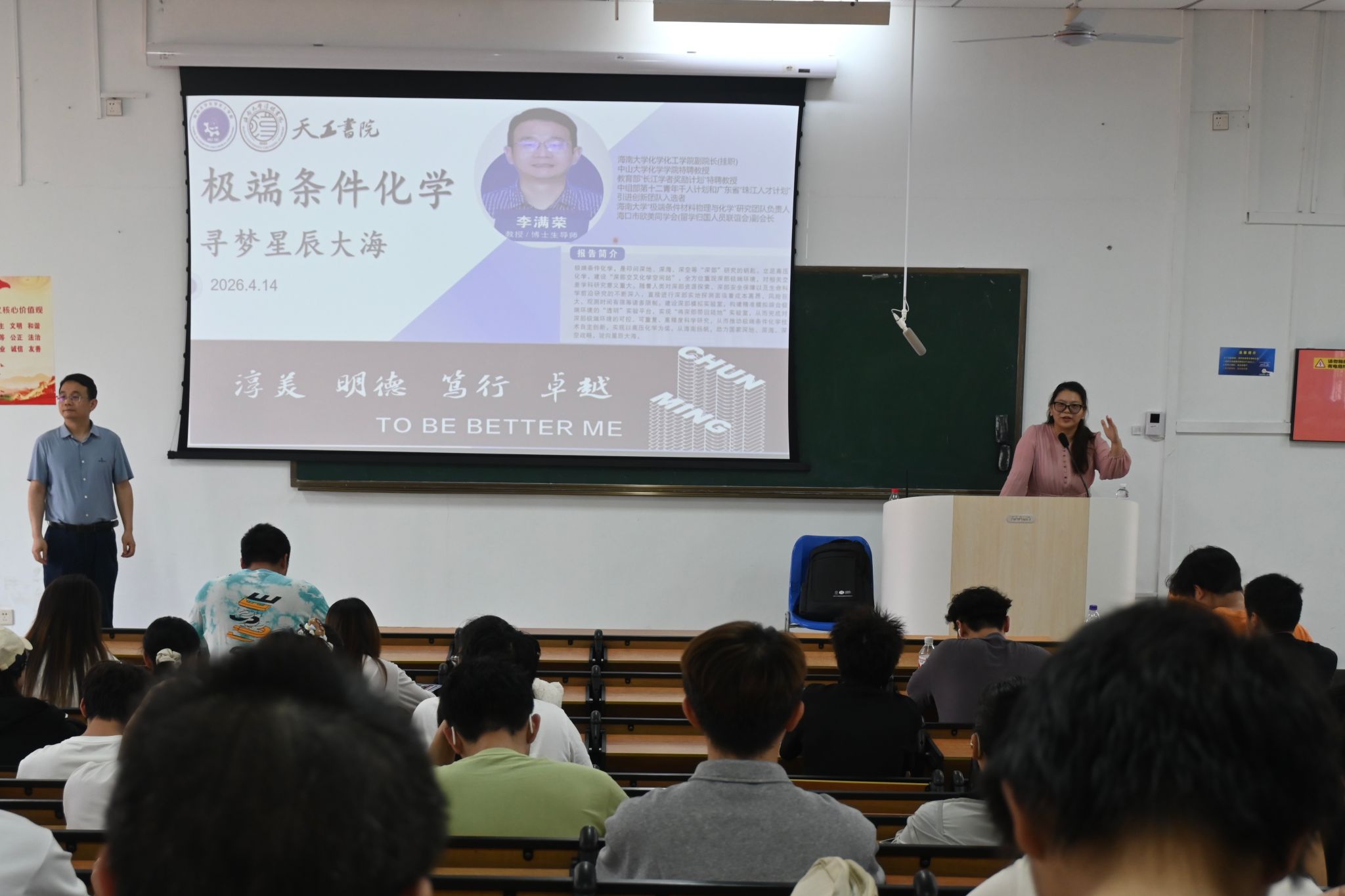 副院长李满荣教授应邀作题为《极端条件化学-寻梦星辰大海》的前沿学术讲座。淳明书院党委副书记武琼主持讲座,淳明书院辅导员钟涛、天工书院辅导员单佳馨与 200 余名澳门银河网上赌场