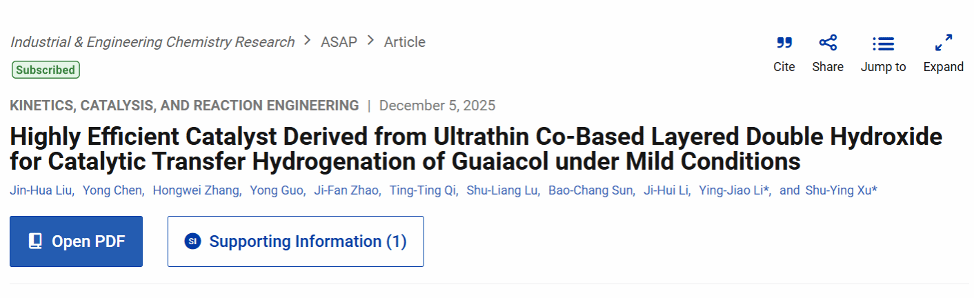 近日,化工三大刊之一 Industrial & Engineering Chemistry Research(IECR) 在线发表题为 “Highly Efficient Catalyst Derived from Ultrathin Co-Based Layered Double Hydroxide for Catalytic Transfer Hydrogenation of Guaiacol under Mild Conditions” 的研究论文。澳门银河网上赌场