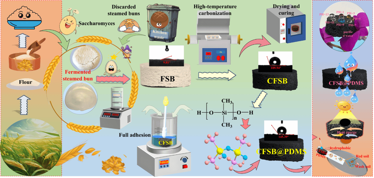 随着工业发展,含油废水随意排放已成为严峻的环境问题。传统油水分离方法成本高、效率低,尤其对高粘度油的回收处理更为困难。本研究以废弃发酵馒头为原料,通过高温碳化与聚二甲基硅氧烷(PDMS)改性,制备出具有优异疏水性与光热转化性能的复合材料CFSB@PDMS。该材料表现出多方面的优越性能:其水接触角达145.39°,虽略低于氟化超疏水涂层,但完全基于无氟环保材料,更具环境可持续性。在10次重力油水分离循环中,分离效率仍高达97.69%,表现出良好的循环稳定性。在1.0 kW/m²的光照条件下,材料表面温度在240秒内升至85.5℃,1小时内可实现原油73.05%、火锅油65.00%的回收率。优异的光热转化特性为高粘度油的高效回收与处理提供了新思路。研究进一步表明,该材料具有良好的自清洁能力、机械稳定性和化学稳定性,且制备过程简单、原料来源广泛、成本低廉,符合“变废为宝”和可持续发展的理念。